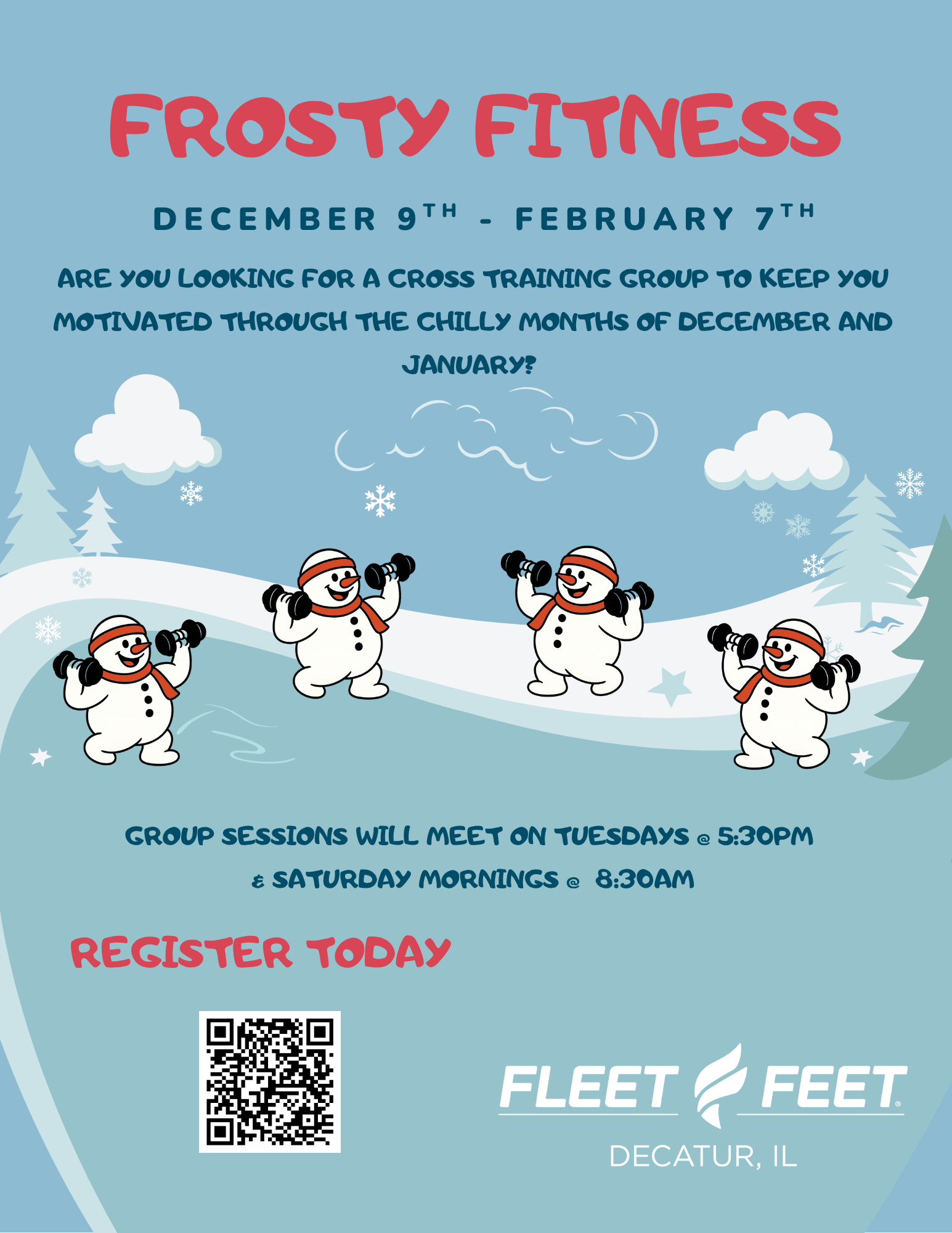 Are you looking for a cross training group to keep you motivated through the chilly months of December and January? Frosty Fitness is the group for you! Frosty Fitness will meet on Saturday mornings at 8am for an hour long strength training session and on Tuesday evenings at 5:30pm for a weather appropriate workout. Saturday strength sessions will include a variety of exercises using equipment such as dumbbells, slam balls, cable station, and steps. Frosty Fitness will begin December 9th and run through February 7th, December 27th and 30th no sessions will be held so you may enjoy your holiday.