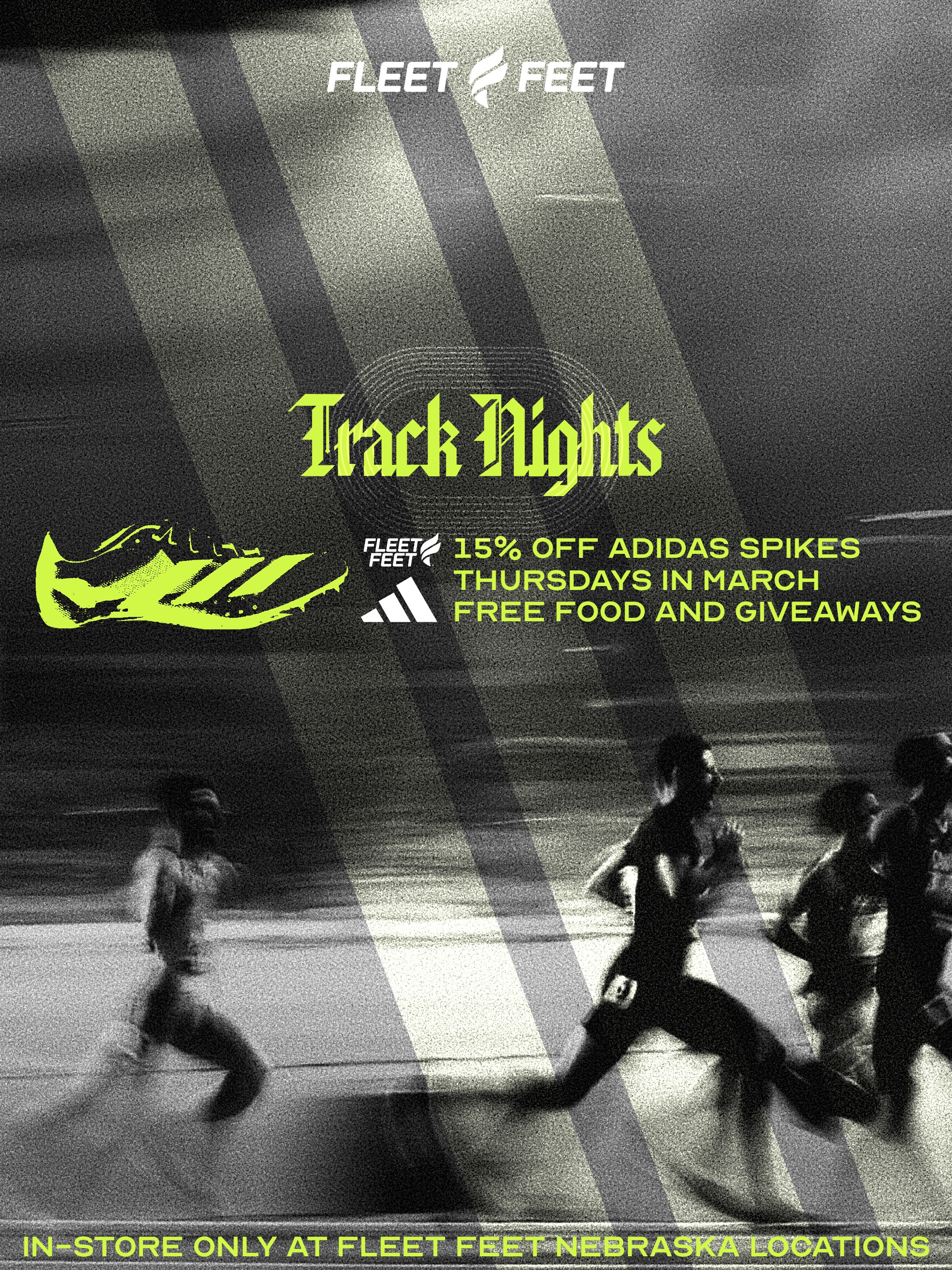 The event will kick off Fleet Feet Lincoln's Track Nights with Adidas. Every Thursday in March, track and field athletes will be welcome to shop in-store to receive a higher discount off Adidas spikes, gifts with purchase, and free food and snacks.
