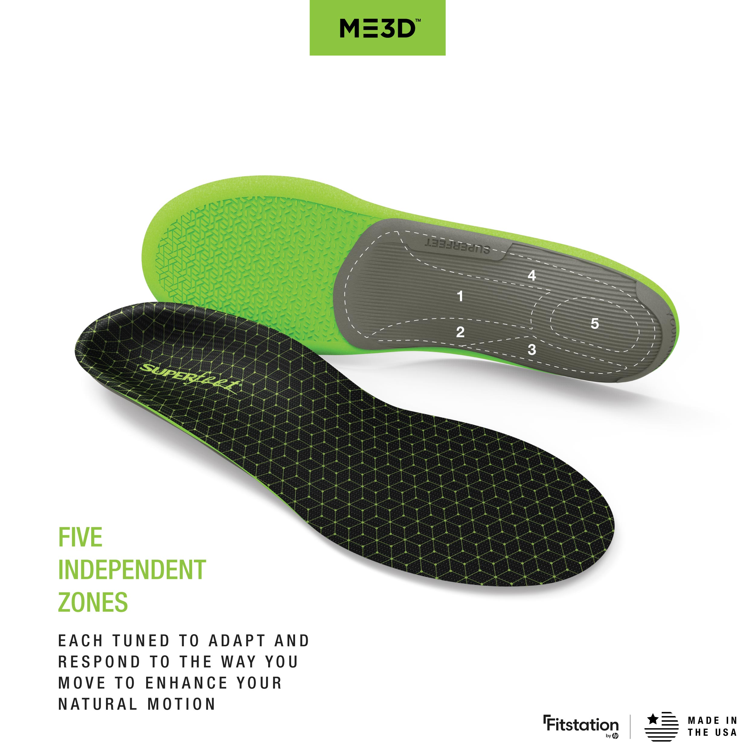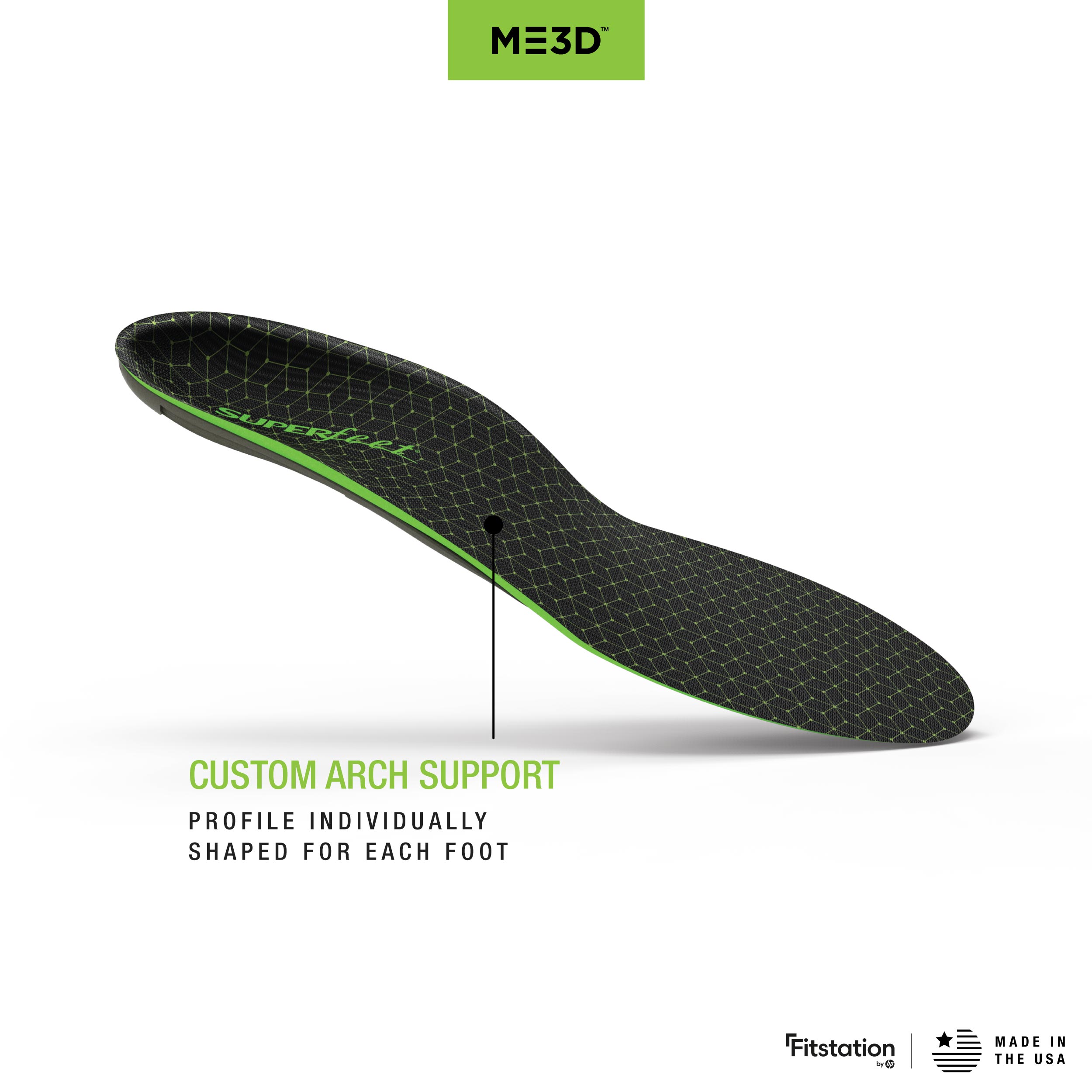 Superfeet's ME3D insoles give you personalized support thanks to Dynamic Pressure Mapping technology. Created to match the geometry of each foot for truly custom support, your customized insoles are made with your unique 3D-printed Superfeet shape for individualized support that moves with you.