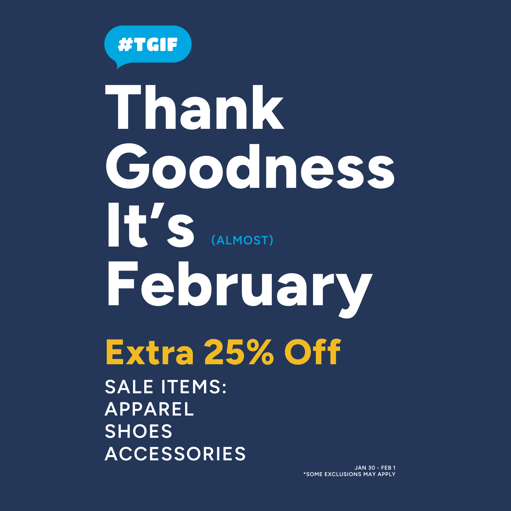 Help us say goodbye to January and make room for a fresh start in February with our TGIF Sale—Thank Goodness It’s (almost) February!