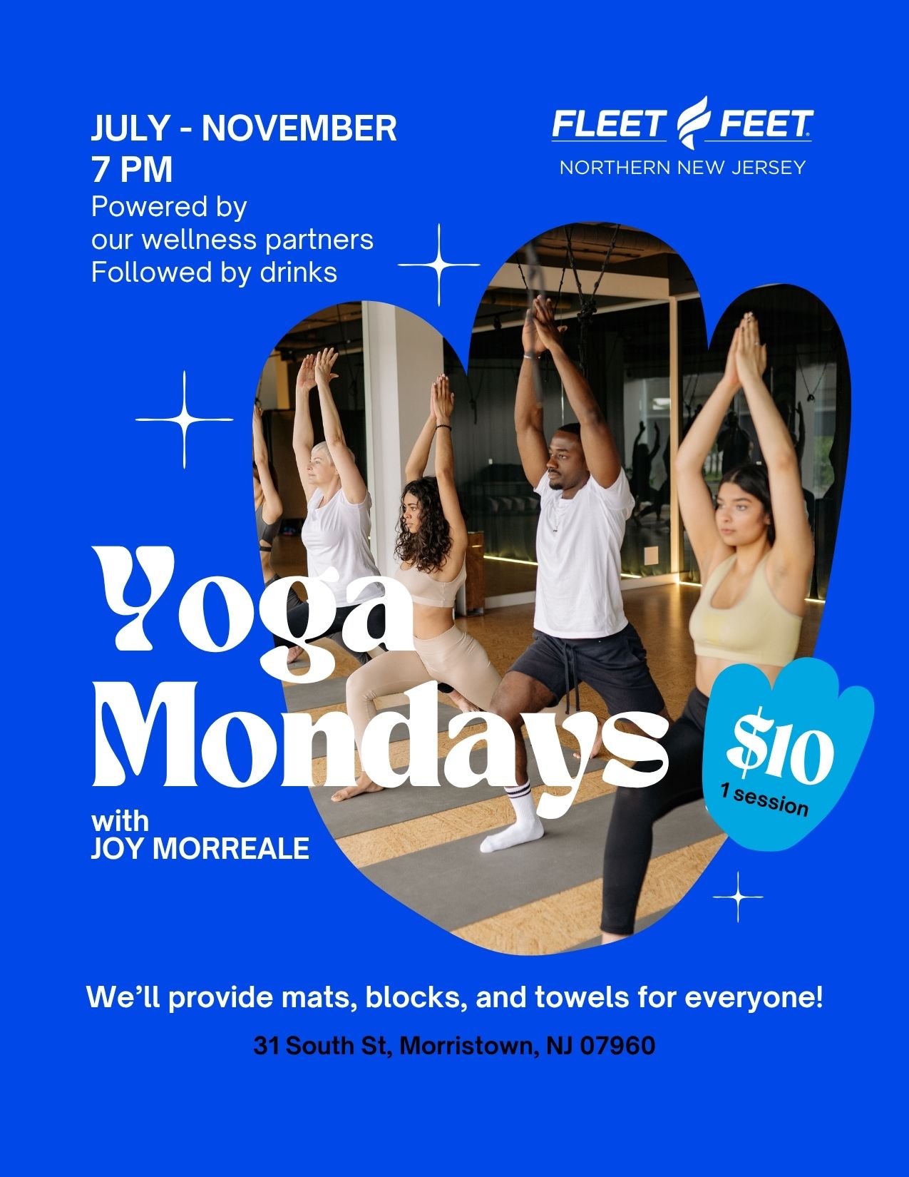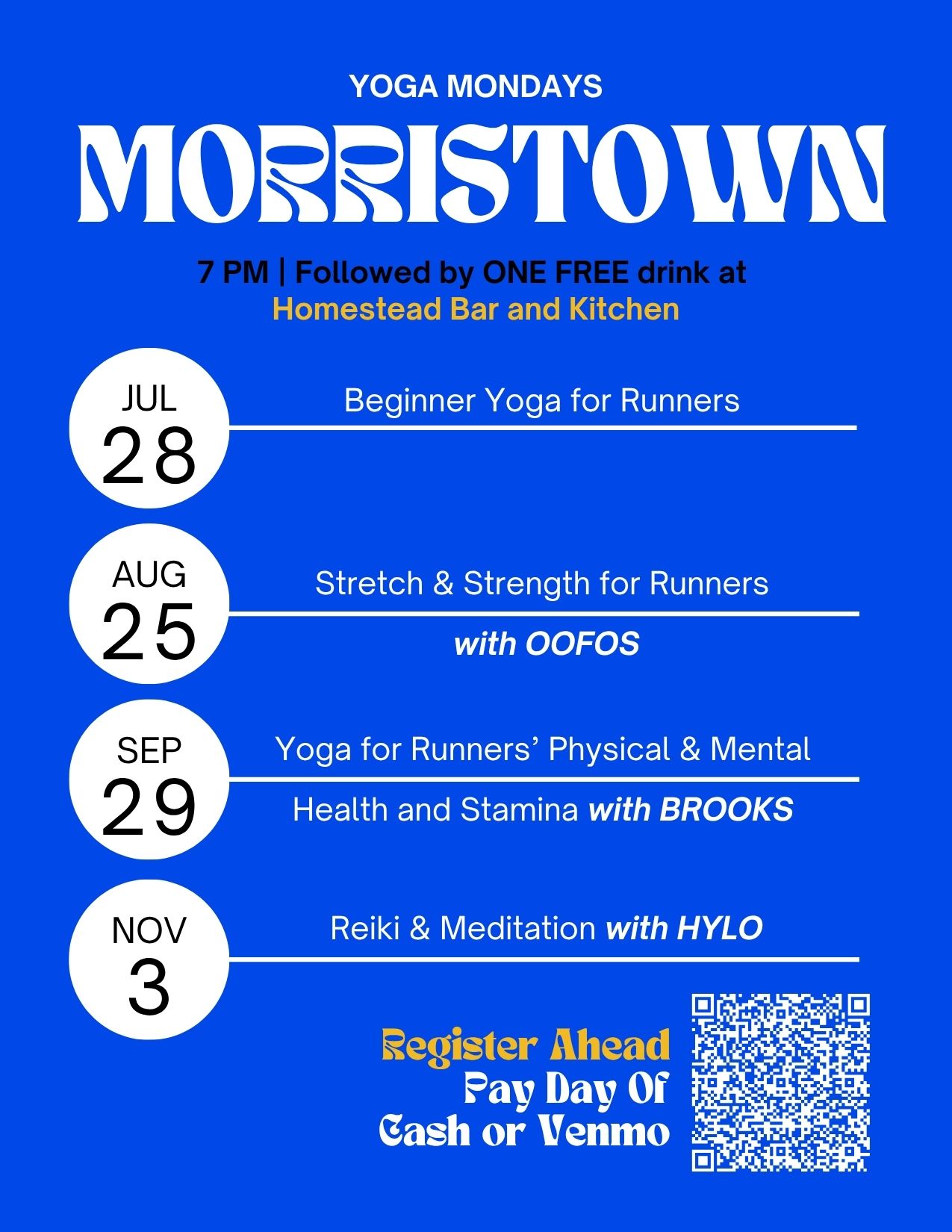 Fleet Feet Morristown will be partnering with yoga instructor Joy Morreale as well as Brooks, OOFOS and HYLO to bring an informative and thorough monthly yoga session to you. Each session will focus on a different style or purpose to better prepare you for training or recovery. You can register in-advance and it will cost $10 a session (pay by Venmo prior to the event), Joy will send an email out to all signed up participants with additional information and payment information prior to the session. Fleet Feet will be providing all the necessary materials, this includes mats, towels, blocks and all participants will receive a complimentary drink afterwards at Homestead Bar and Kitchen!