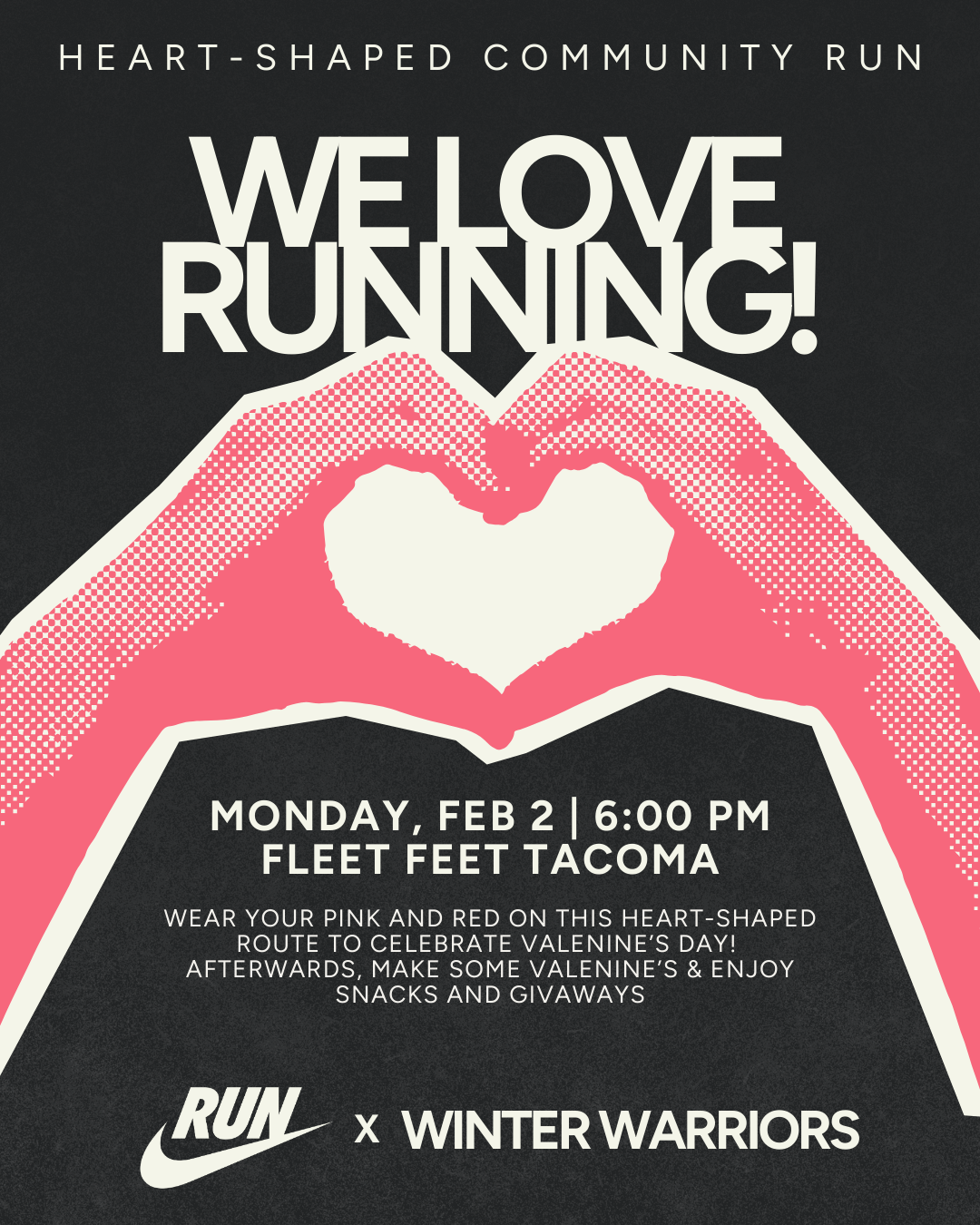 Wear your pink and red on this heart-shaped route to celebrate ValenIne’s Day! Try the latest Nike gear, make some Valenine’s for the people you love, enjoy post-run snacks and givaways!