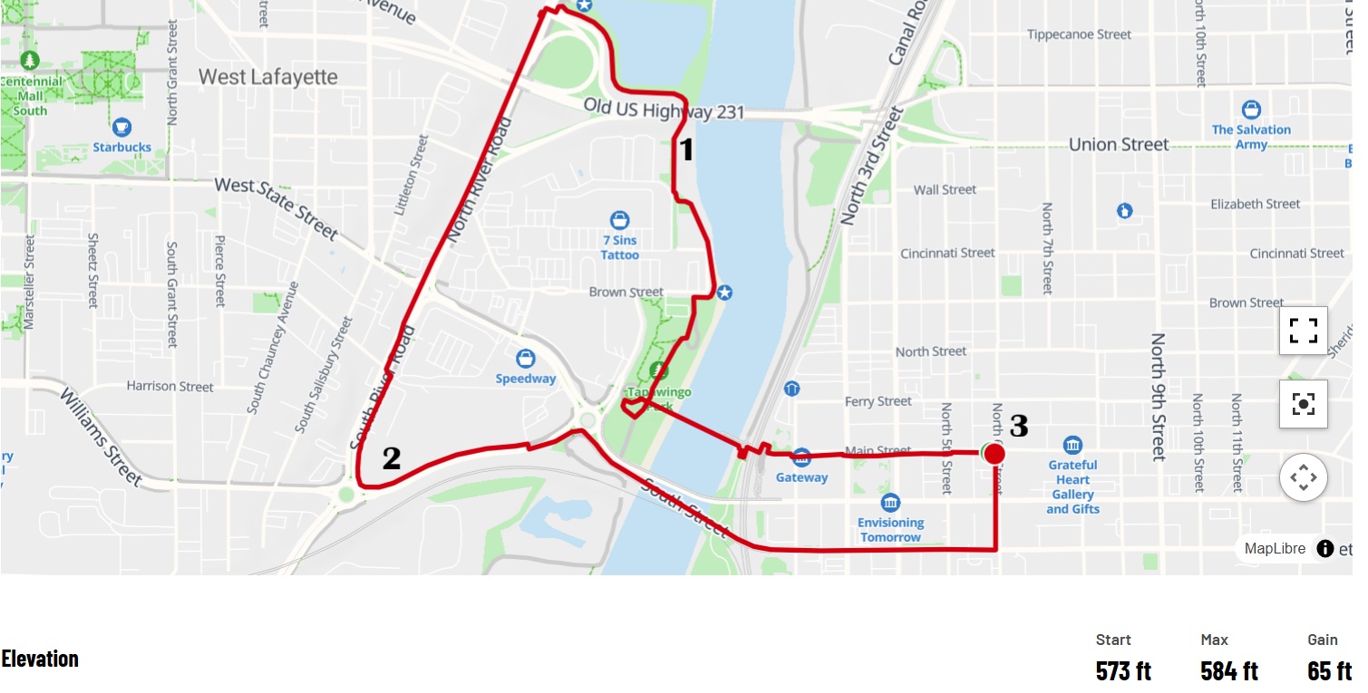 Head West on Main Street towards Pedestrian Bridge, Cross Pedestrian bridge and take left off bridge and go underneath it, follow path to North River Road, cross River Road heading towards Williams, Right on Williams towards Martin Jischke, Right on Martin Kischke towards State, Right on State towards South Street, Cross bridge towards 6th Street, Left on 6th Street towards Lobby, Finish at The Lobby!