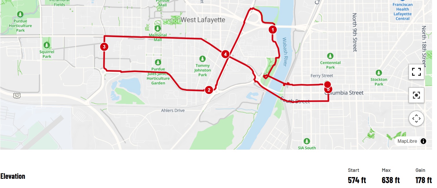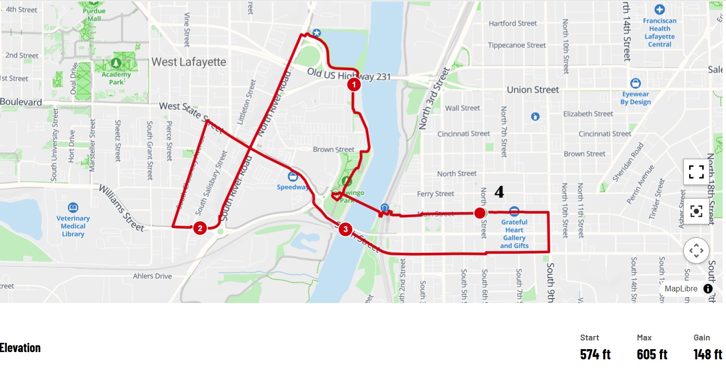 We will meet at 8:00 am at 526 Main Street, Lafayette, Indiana and we will start walking or running at 8:15 am. We will have turn by turn directions for 3, 4, and 5 mile routes that take you through West Lafayette!
